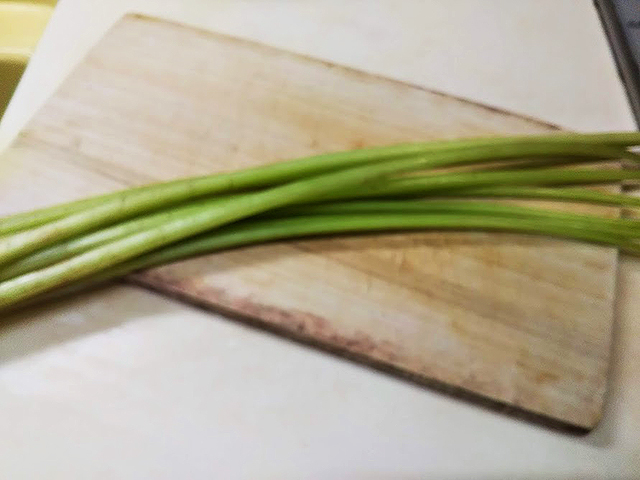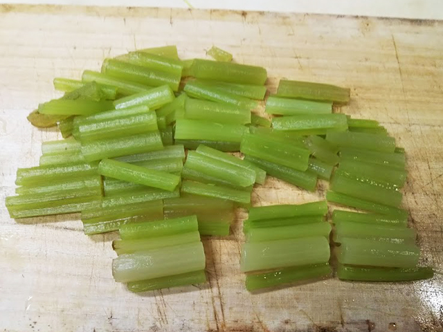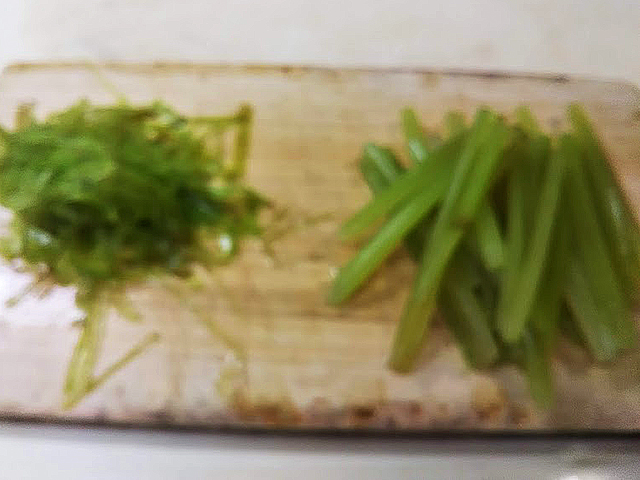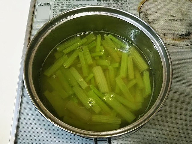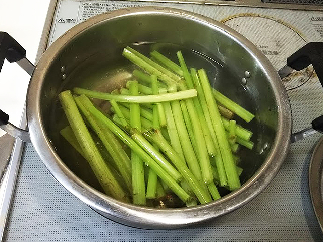 1. 蕗は鍋に入る大きさに切りそろえ、板摺をしたあと、たっぷりの湯で茹でる