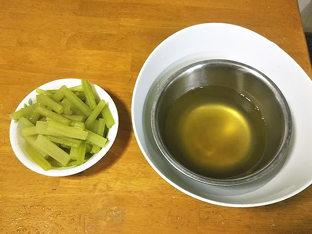 2. 茹で上がった蕗は冷水に浸して色止めする