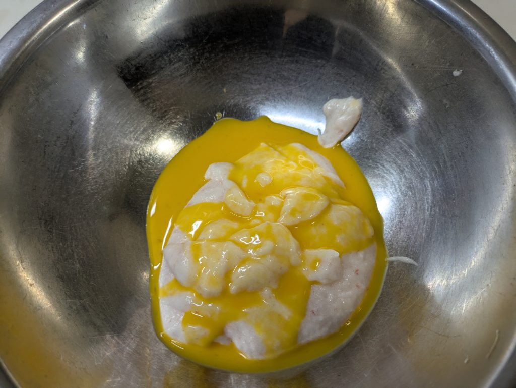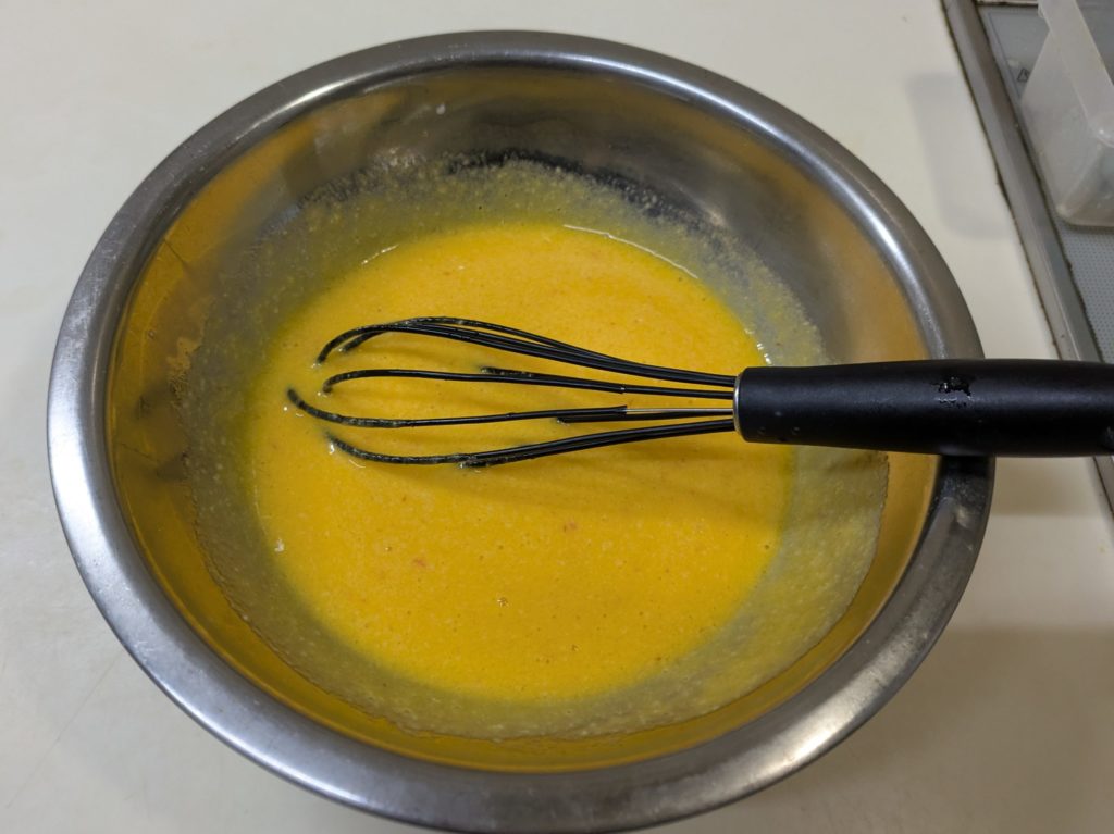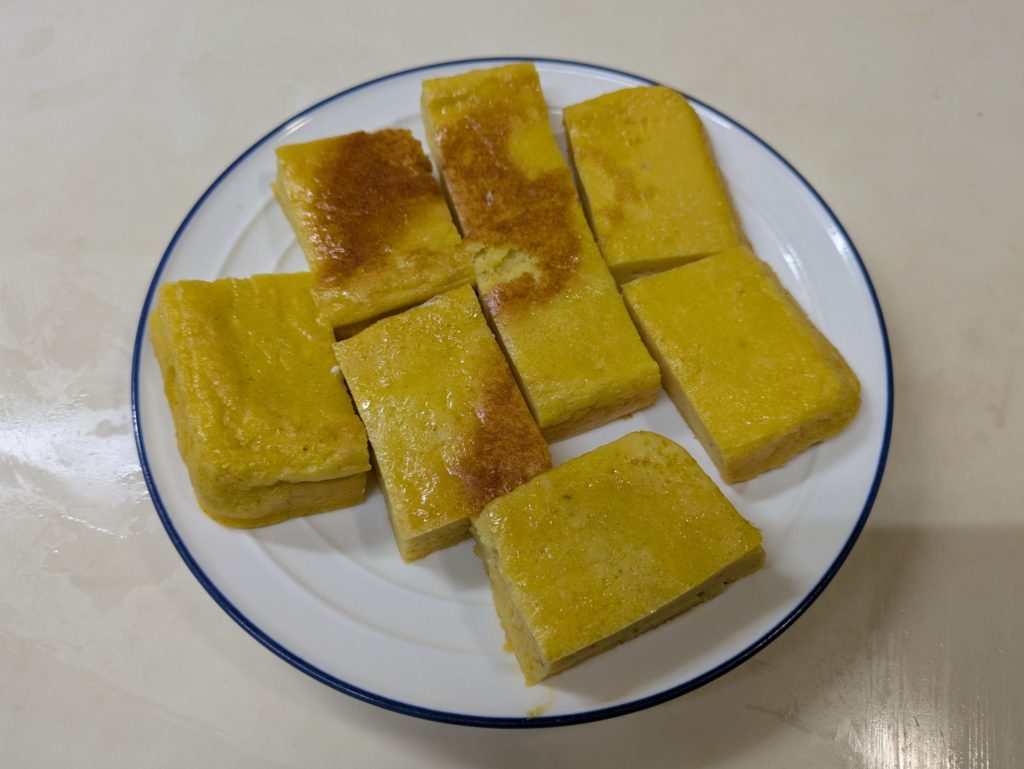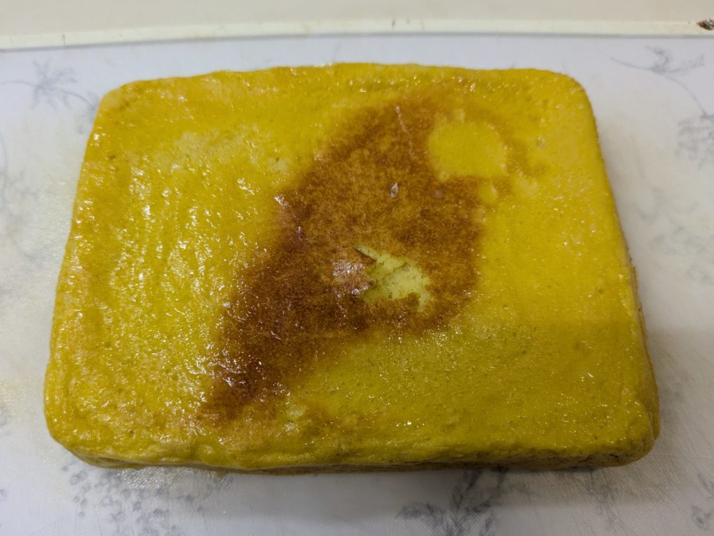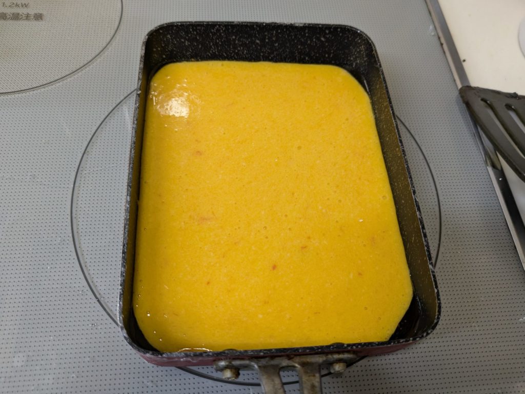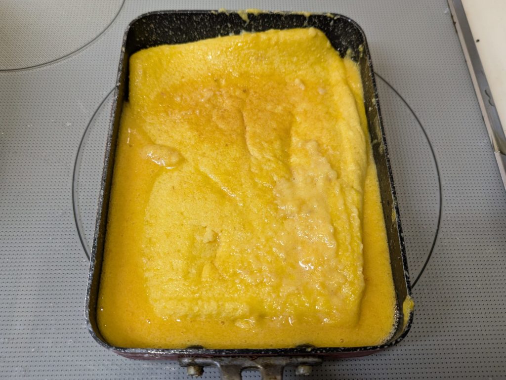 ミッドナイト屋台に出てきたカステラ玉子焼きを作ってみました。本来カステラのように表面はこんがり、中はふんわり…となるはずなんですが、いわゆる普通の厚焼き玉子のようになってしまいました。元のレシピは材料をミキサーで粉砕したあと、さらにすり鉢で摺るのですが、我が家にはすり鉢がないので省略しました。それと、やはり火加減の調整が大切ですね。