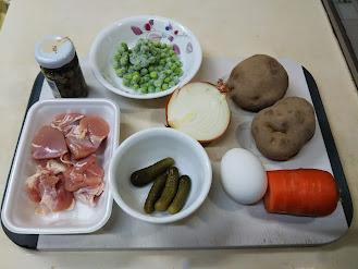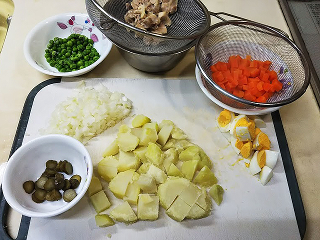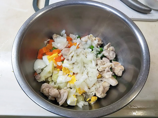 2. じゃが芋はレンジで加熱後、濡れ布巾で皮を剥き、芽を取り除いて1㎝位に切る。冷凍グリーンピースはさっと水洗いしてレンジで1分程加熱する。玉葱は微塵切り、ゆで卵は1㎝位のざく切り、ピクルスは5㎜位の輪切り、人参は5㎜位角切りに切る