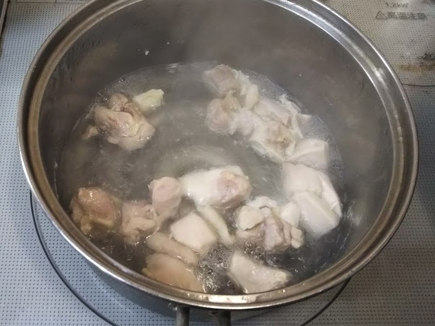 1. 鶏胸肉は1㎝程度に切っておく。鍋に酒を入れた湯を沸騰させ、鶏胸肉を茹でてザルで水を切る。煮汁はスープに使用する