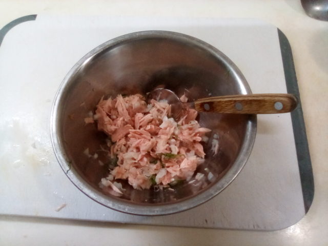 1. ツナ缶詰は油を切っておく。玉葱は細かい微塵切りにする。