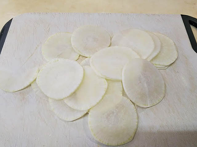 1. 大根は皮を剥いて、スライサーなどで薄い輪切りにする