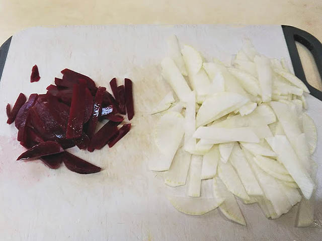 2. 輪切りにした大根を幅1㎝位の短冊切りにする。ビーツも幅5㎜位の千切りにする