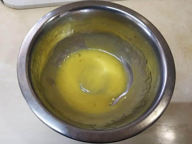 3. ドレッシングを作る。オリーブオイル、白ワインビネガー、レモン汁を入れてよくかき混ぜ、砂糖少量と塩胡椒で味付けする