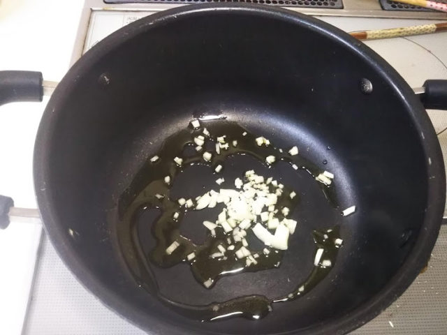 2. 鍋にオリーブオイルとニンニクを入れて熱する