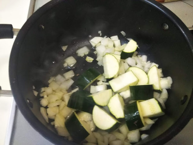1. ズッキーニと茄子は一口大に切り、玉葱は1㎝角に切り、ニンニクは微塵切りにする