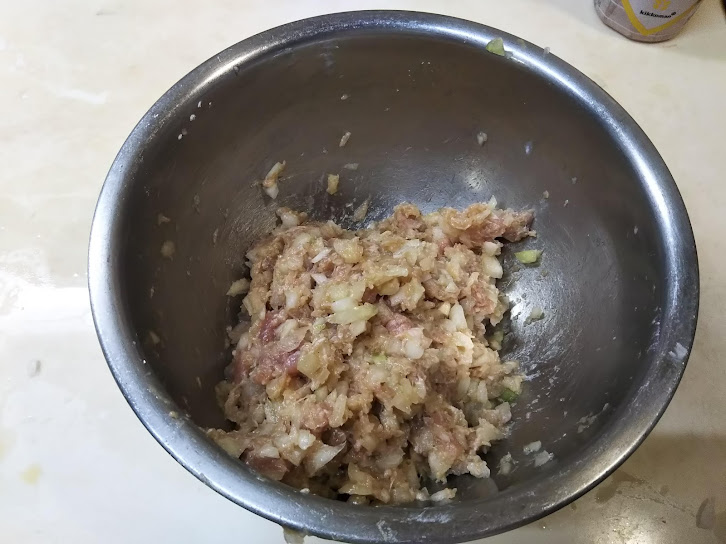 4.玉ねぎと肉を手でよく混ぜ合わせ、調味料を加えてよく捏ねていく。最後にコーンスターチを加て混ぜ合わせる