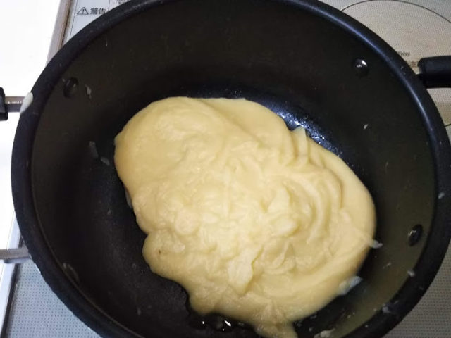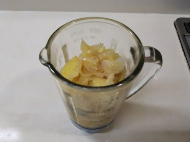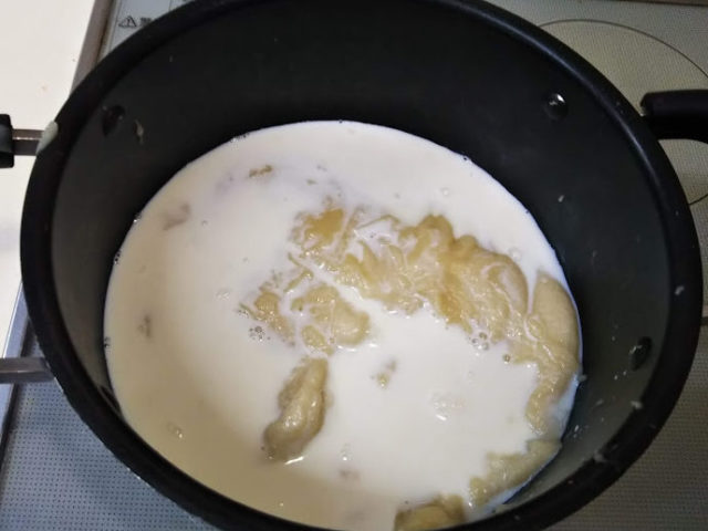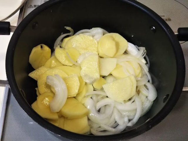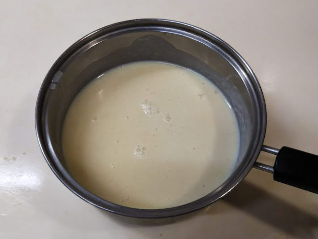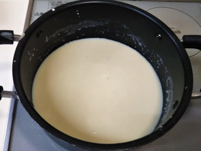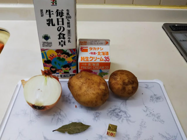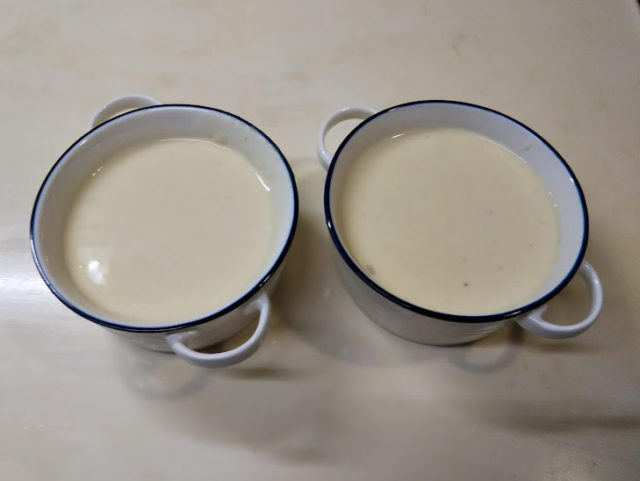 ご存知冷たいじゃがいものポタージュです。じゃがいものポタージュを冷やすだけでもいいのですが、私は食べる前に生クリームを追加しています。