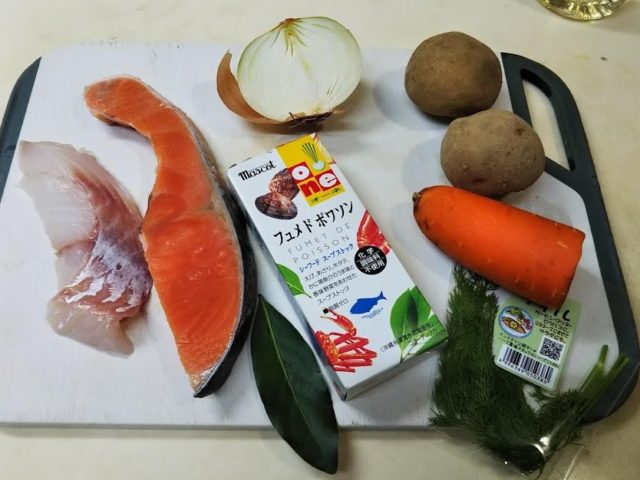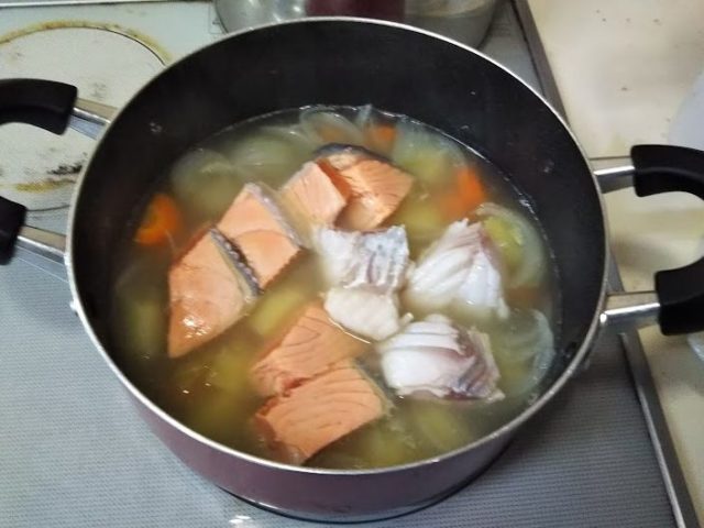 ウハーはロシアの魚を使ったスープです。魚は鮭、鱈、鱸など白身魚がよく使われるようです。今回は鮭と鱈で作ってみました。