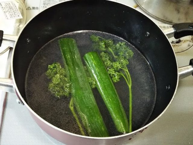 3. 鍋に水、フュメドポワソン、長葱の葉、ローリエ、パセリを入れて弱火で煮る