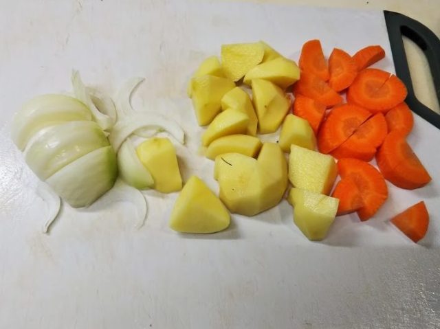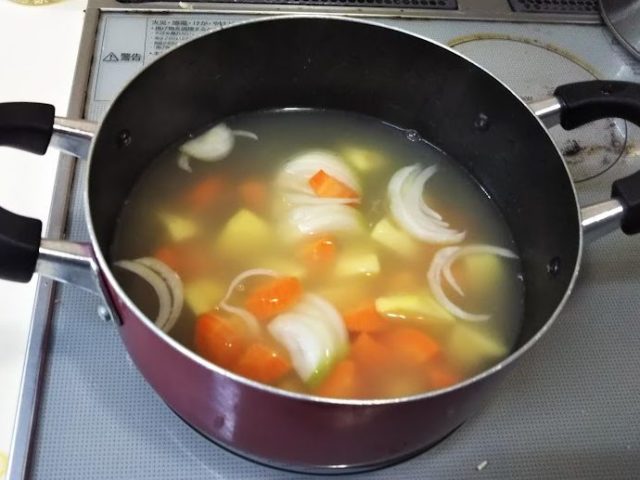 5. スープが煮えたら葱やハーブを取り除き、人参、じゃが芋、玉葱を入れて中火でやわらかくなるまで煮る