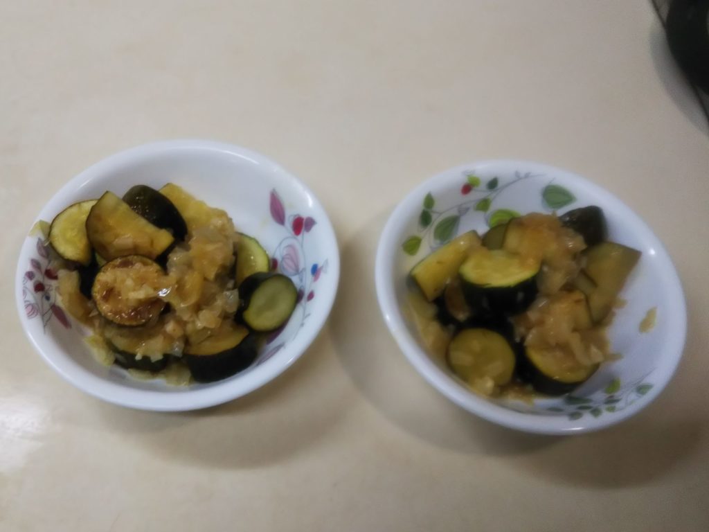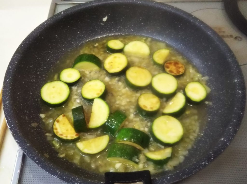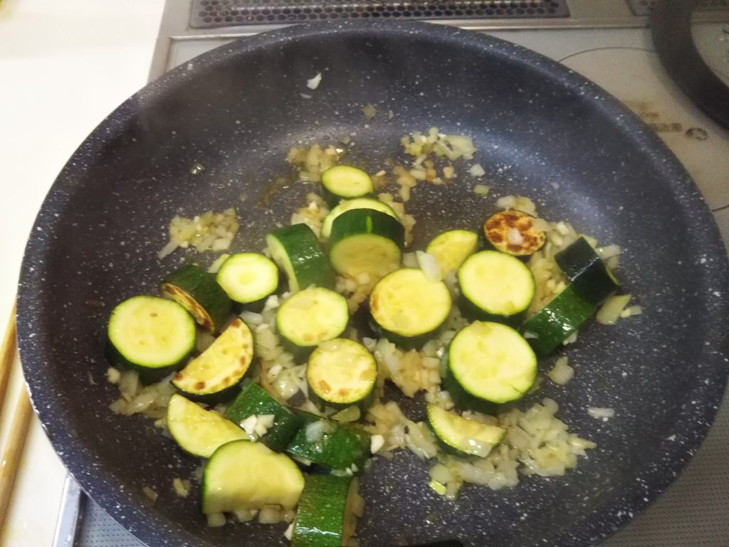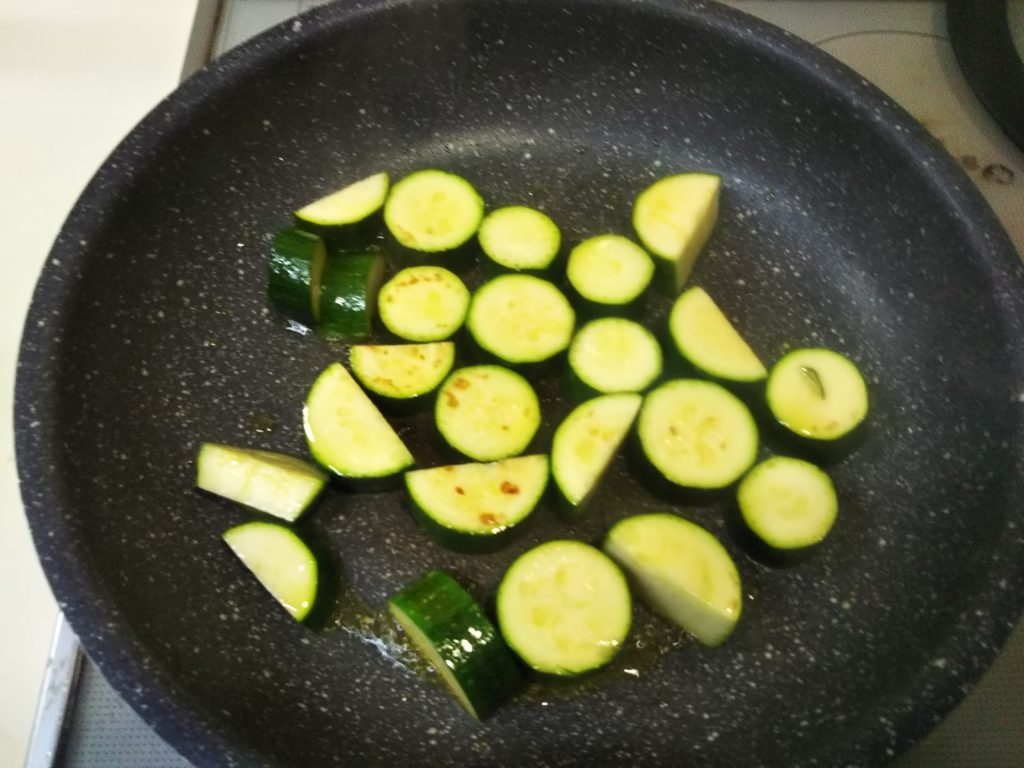 2. フライパンにオリーブオイルを温めズッキーニを両面軽く焼き色が着くくらいにやいて、一旦皿に取り除ける