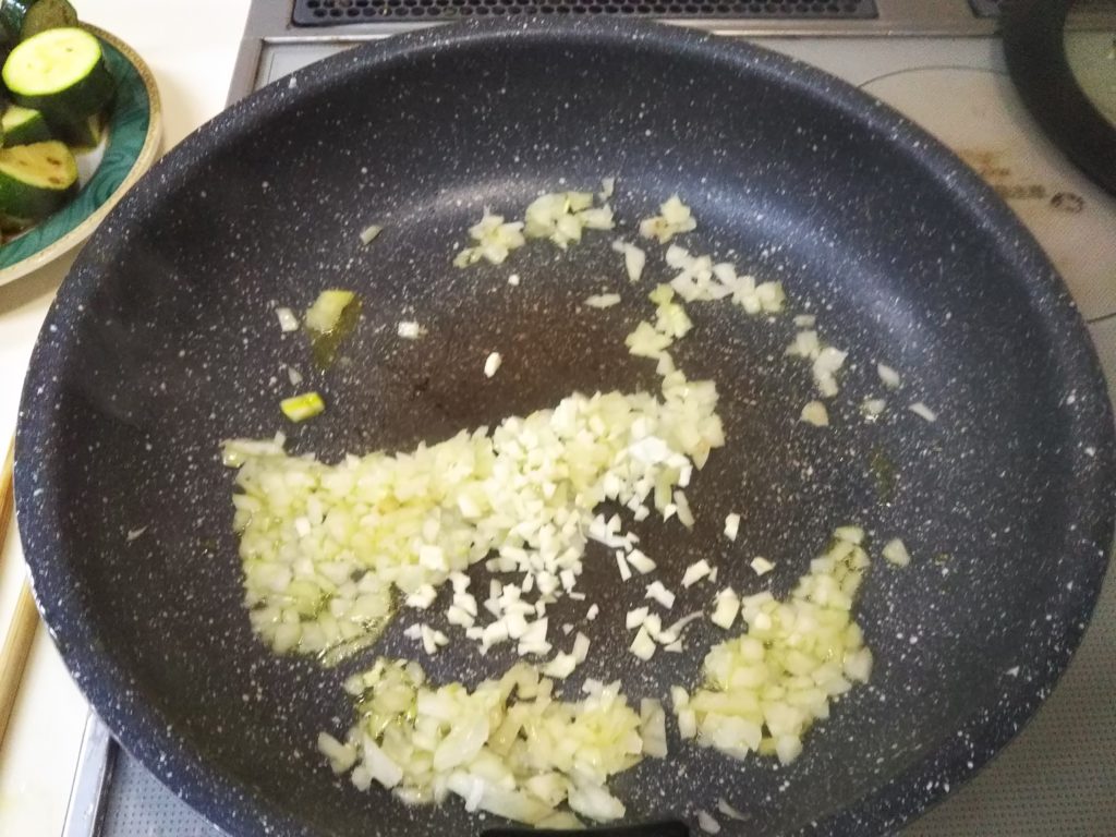 3. ズッキーニを焼いたフライパンに必要なら油を足して、玉葱を炒める。玉葱が柔らかくなったらニンニクを加える