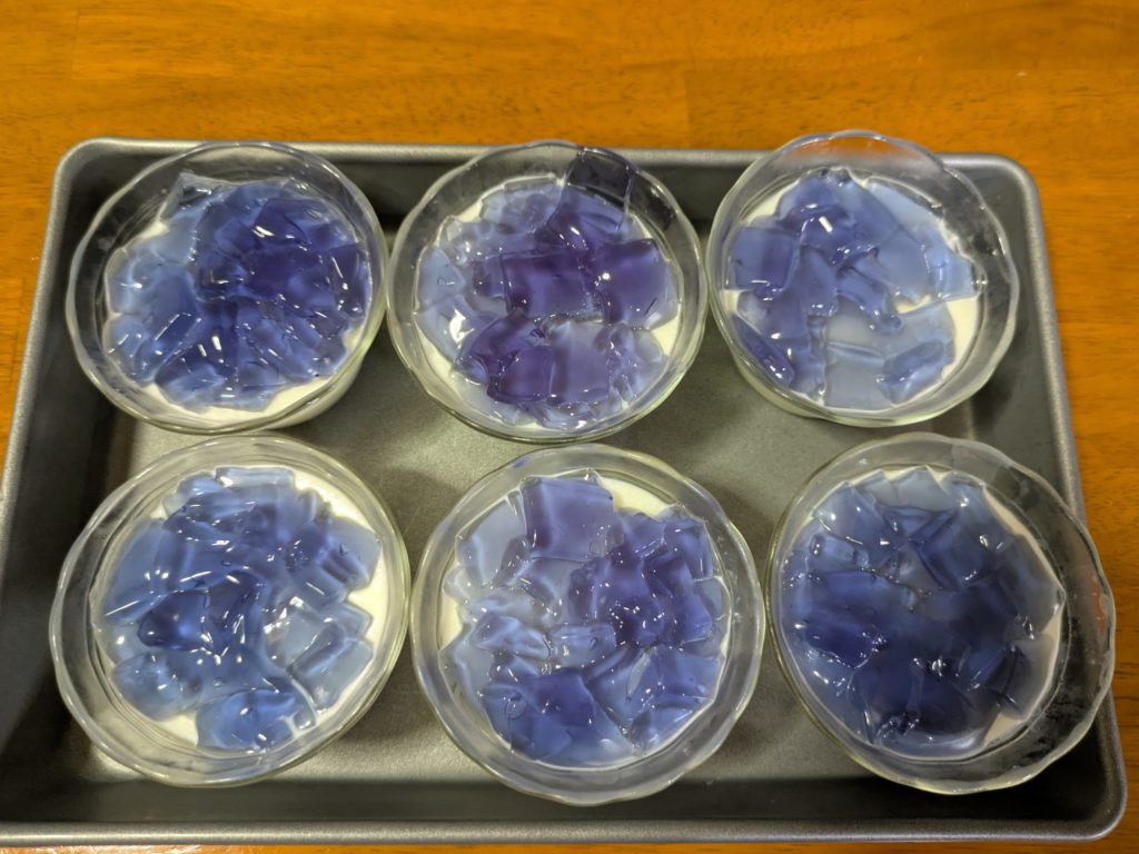 パンナコッタの上にバタフライピーのゼリーを乗せて紫陽花を象ったデザートです。