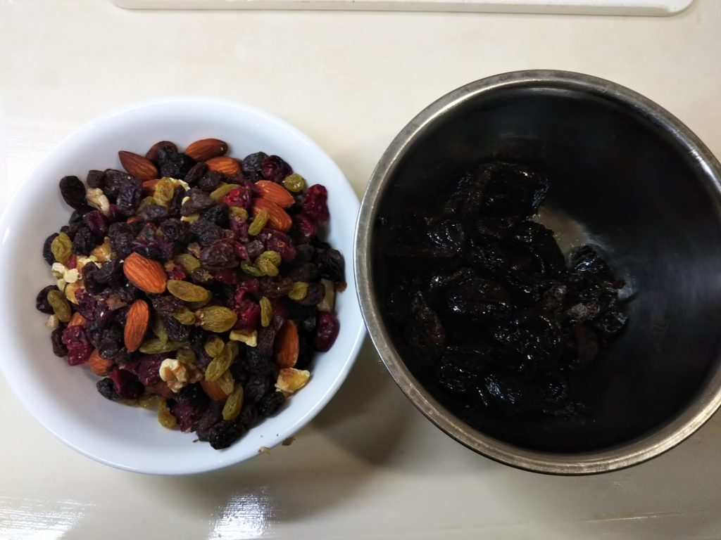 1. レーズン、カレンツ、その他ドライフルーツはプラムと合わせて500g計る。プラムや大き目のフルーツはレーズンと同じくらいの大きさに切る