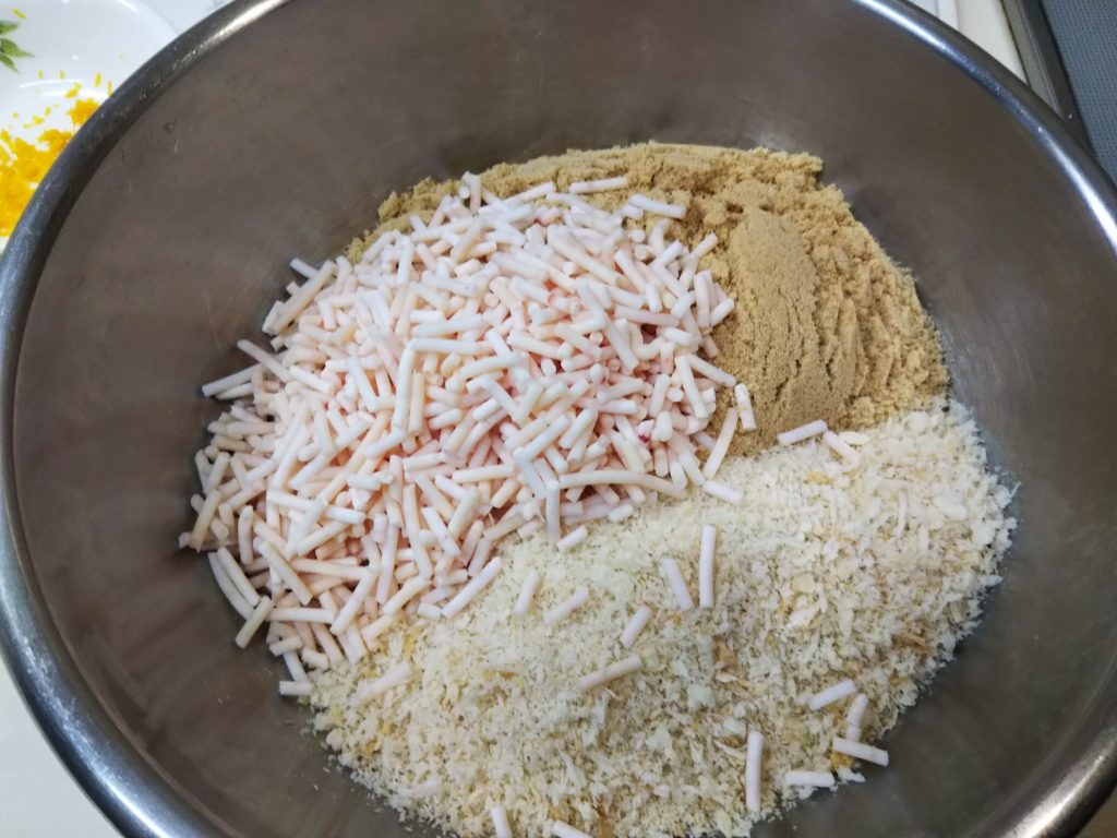 5. 4.のボウルに1.のフルーツ、2.のリンゴ、3.の果汁と果皮、アーモンドを入れてよくかき混ぜる