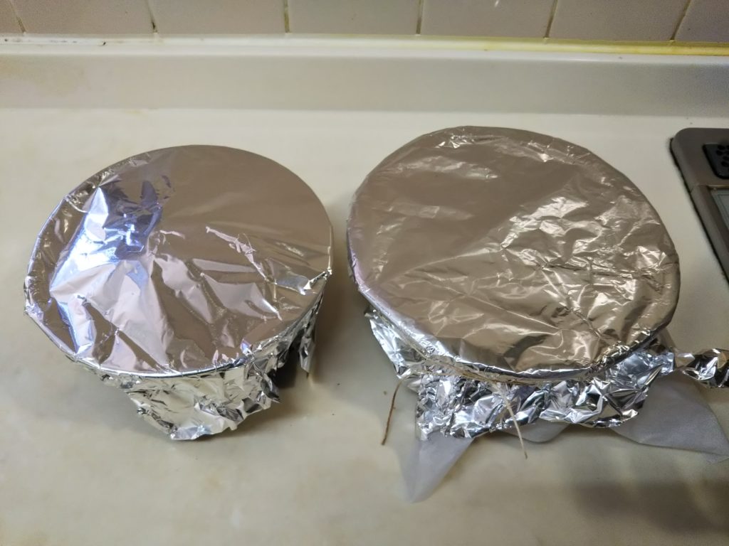 10. それぞれの型をクッキングペーパーで覆い、更にアルミホイルで覆い、タコ糸でしっかりと縛り付ける