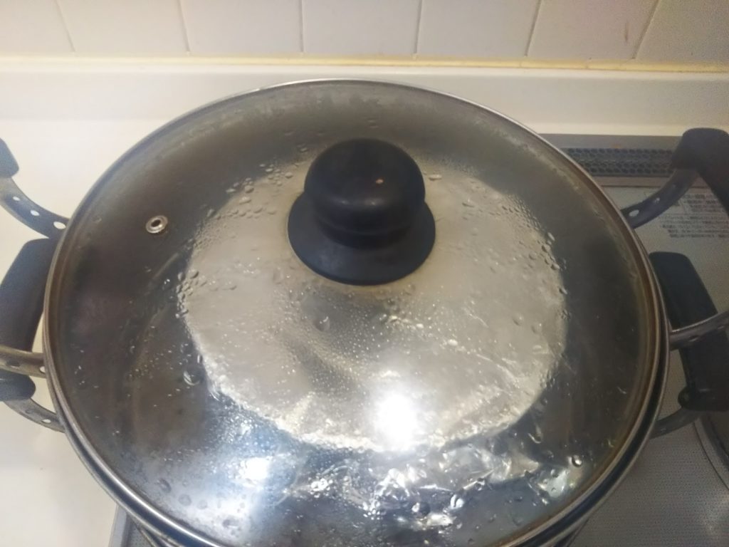 12. ボウルのほうは沸騰している蒸し器に入れて約5時間蒸しました。(4時間位でも大丈夫のようです)途中何度か熱湯を足しました。