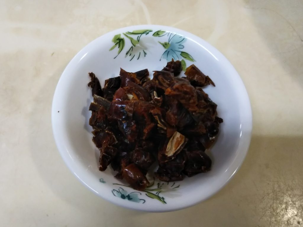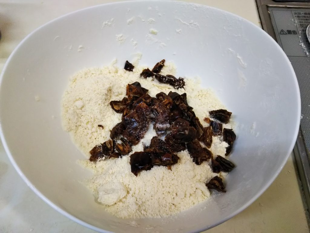 1. バターは包丁でサイコロ状に切って冷蔵庫に入れておく。デーツも約1㎝位に細かく刻む(大きさは、お好みで)