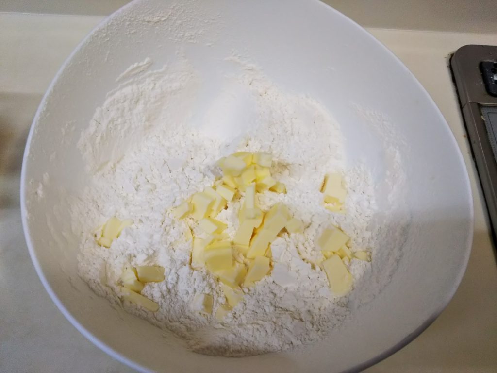 4. 冷蔵庫から出したバターを粉とすり合わせ、粉チーズ状にしていく。