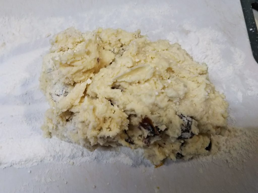7. 打ち粉をしたまな板の上にのせ(この段階ではべたべたしていても構わない)、粉を付けた手で生地を伸ばしたは折りたたむ作業を2,3回繰り返す