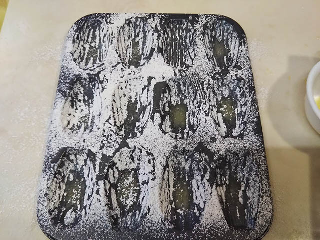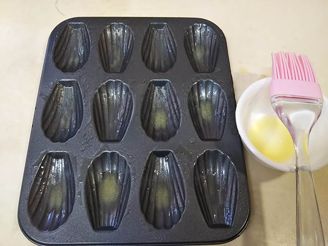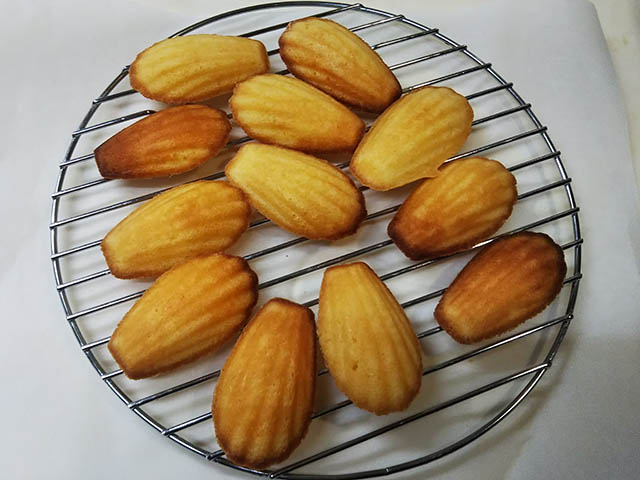 エルダーフラワーのシロップを塗ったプチットマドレーヌです。マドレーヌとプチット・マドレーヌは一体どこで区切るのか?はっきりわからないのですが、私が今回使用したのが長さが7㎝で一皿に12個分作れる型でした。いつも使っているのは一皿6個、長さがなんと8㎝でした。長さは1㎝しか変わらないけど、太さや深さが違うので8㎝の型の6個分が7㎝の型でそのまま12個分作れました。