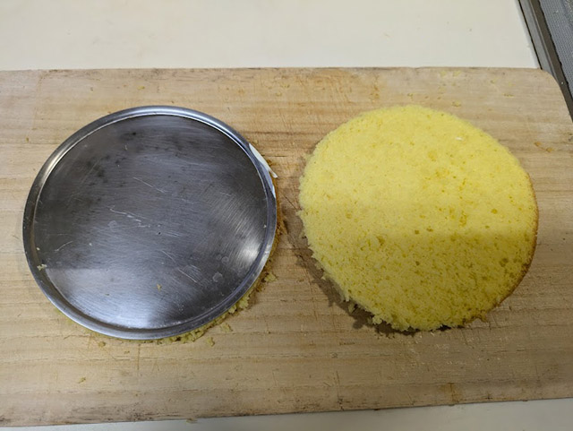 3. スライスしたスポンジ2枚を15㎝丸型に合わせて切り取る