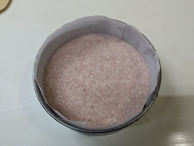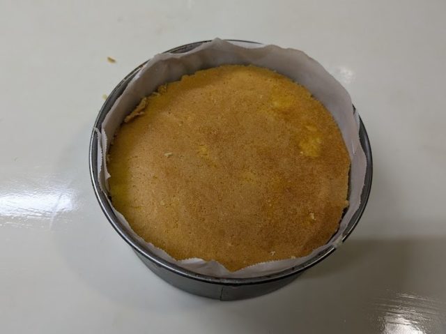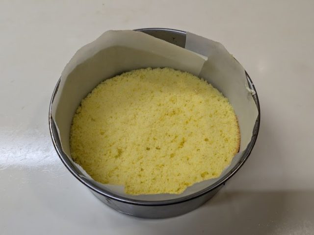 4. 直径15㎝の丸型にクッキングシートをセットして3.で切り落としたスポンジの1枚を底に敷く
