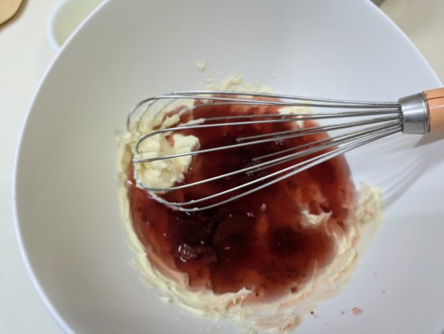 5. 室温で戻したクリームチーズを泡だて器で柔らかくホイップする