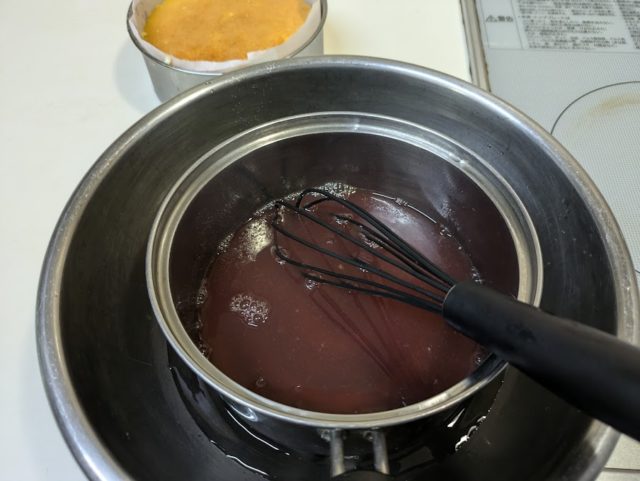 12. 大き目のボウルに氷水をはって、ゼリーを鍋ごと冷やす。冷やし過ぎると固まって扱いにくくなるので注意