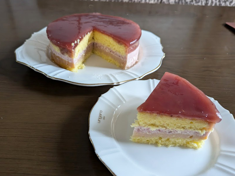 それで、イチゴのフルーチェで作ったレアチーズケーキをスポンジで挟み、トップにラズベリーゼリー乗せたチーズケーキを作ってみました。ラズベリーゼリーはピュレでなくジャムを使ってみましたが割と形が整いました。