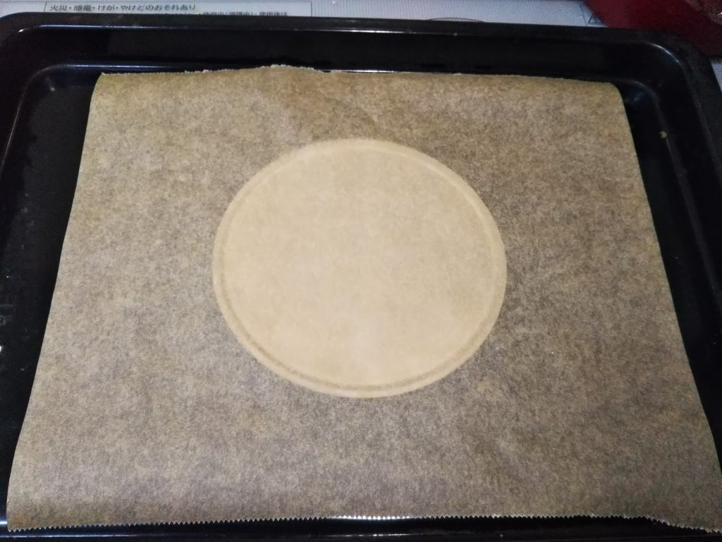 3. 天板の中央に底が取り外せる丸形の底の部分を敷き、その上にクッキングシートを乗せる。これがガイドラインになる。型がない場合は、クッキングシートの裏側から15㎝の円を描く