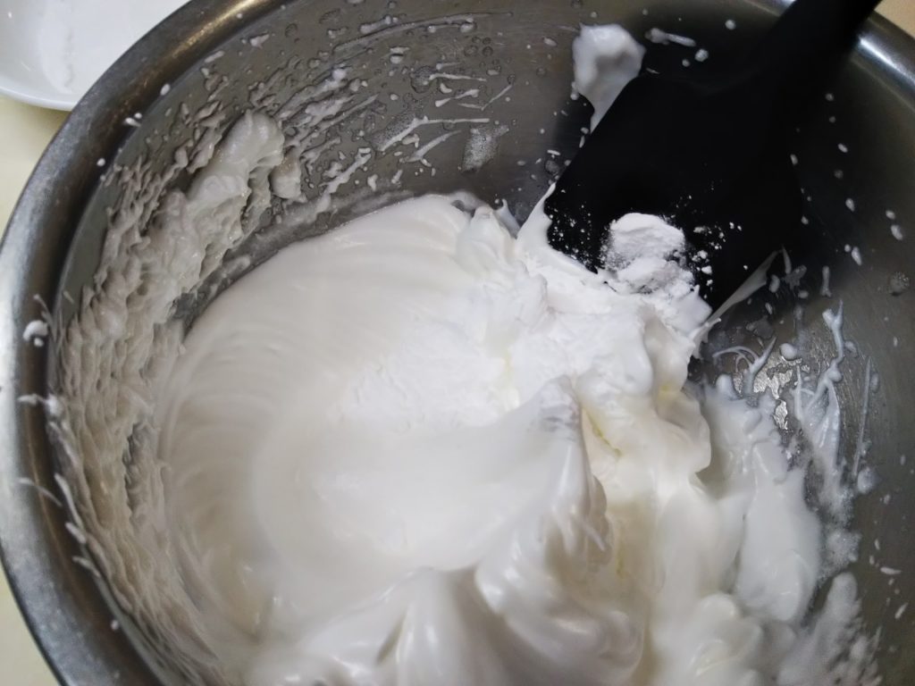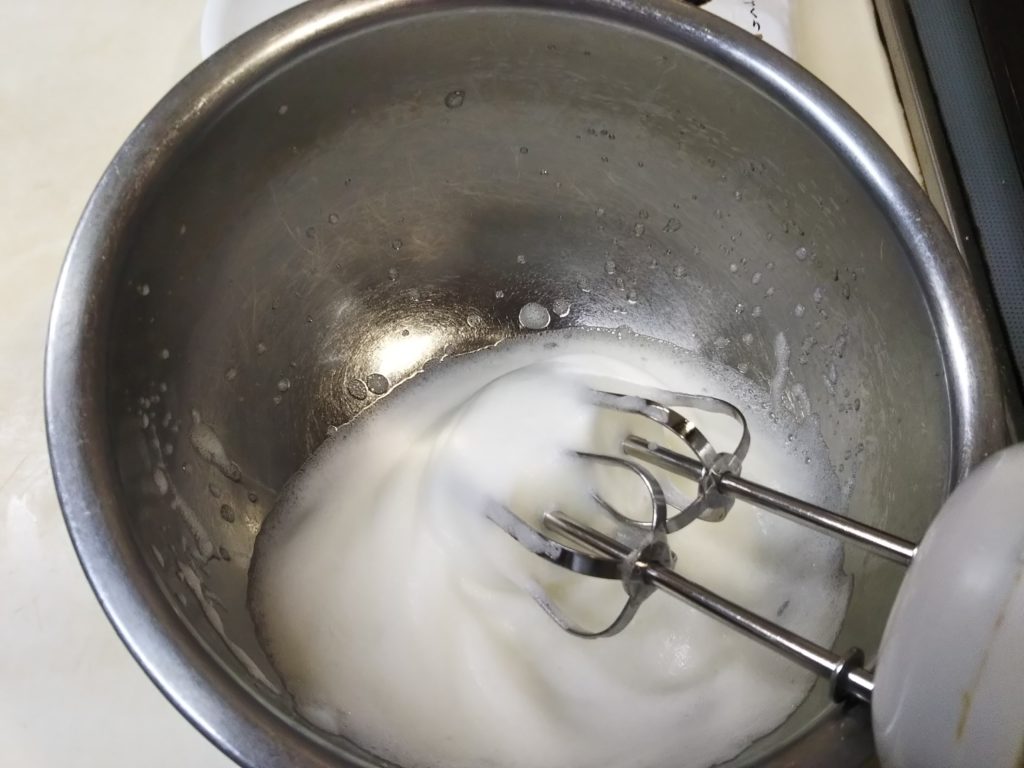 1. ボウルに卵白を入れてハンドミキサーで泡立て、白くもったり泡状になったら最初の砂糖の1/3を加える。ミキシングしながら砂糖を3回に分けて加える。