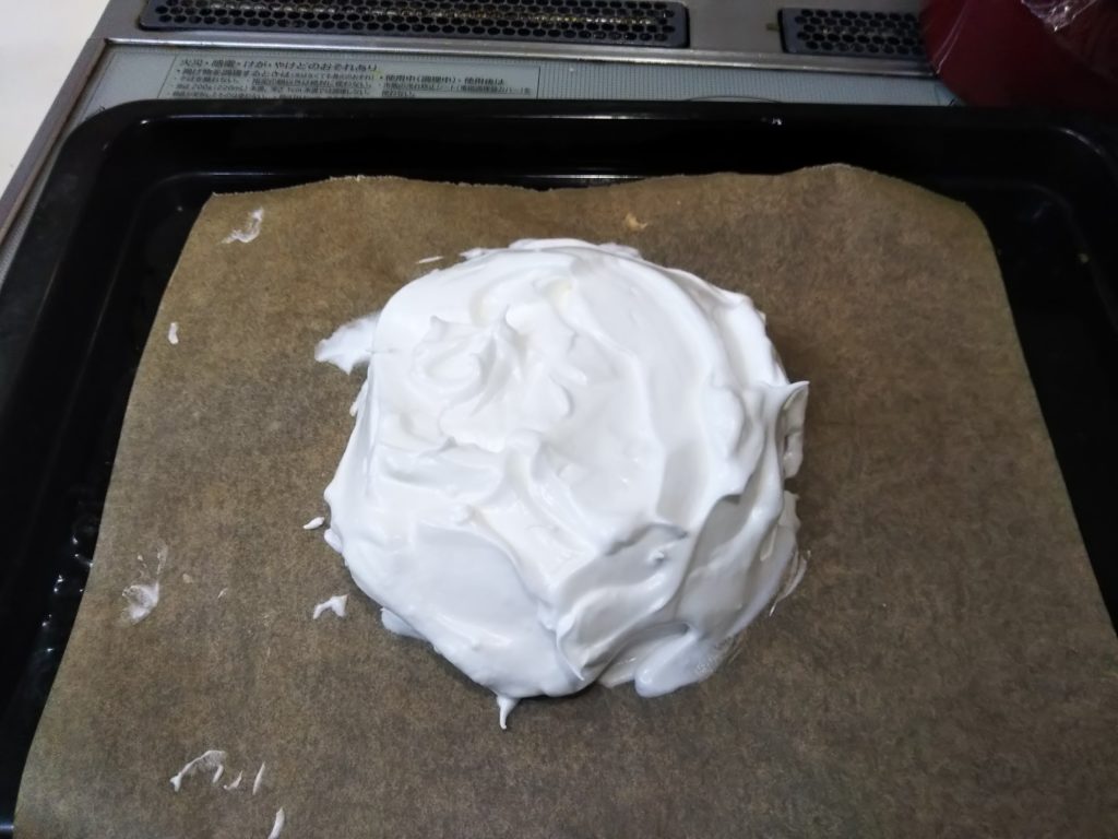 4. 2.のメレンゲを丸形の底に合わせて円盤型にこんもりと盛り付け、焼く前に下に敷いた底を取り除く。焼きあがった後へこむのでできるだけ高めに盛り付ける。120℃のオーブンで90分焼く。焼きあがった後はオーブンの中で冷ます