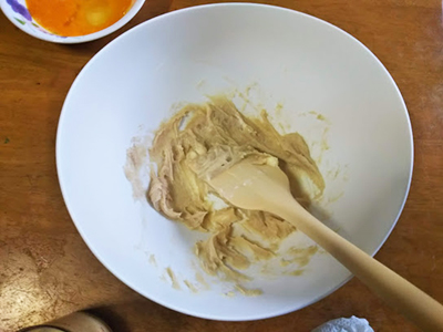 2.室温で戻したバターを塊がなくなるようヘラが泡だて器でよく混ぜる。砂糖を3回に分けて少しずつ加えながら混ぜ込んでいく。