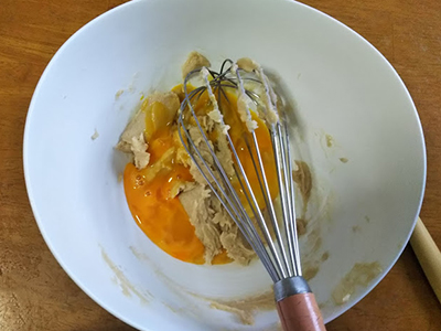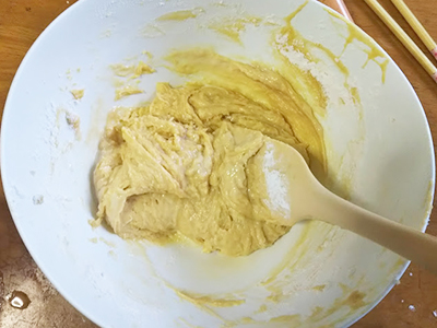 3.溶いた卵を3回に分けて加え、混ぜ込んでいく。