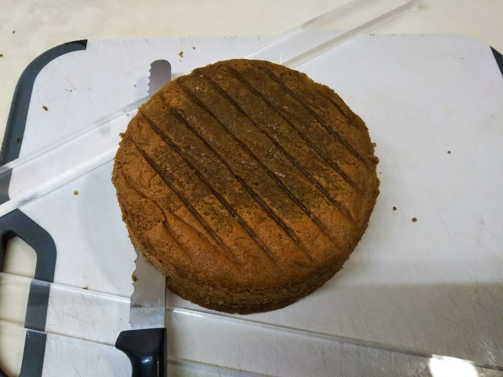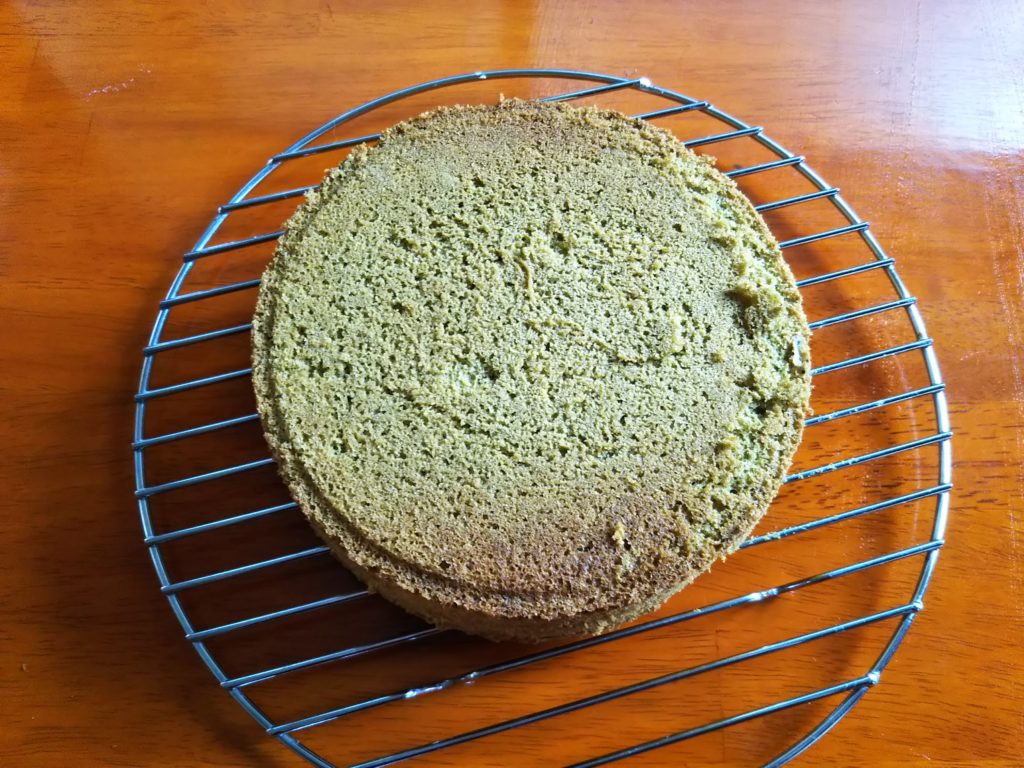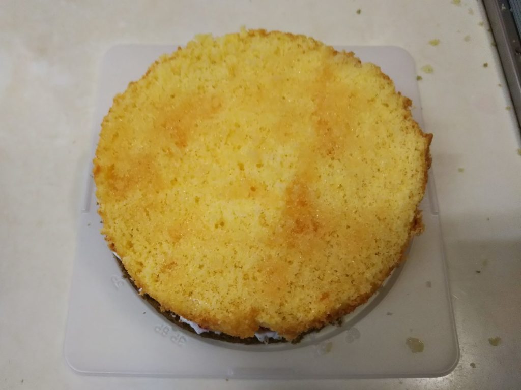 2. スポンジが完全に冷めたら上の膨らんだ部分を切り落とし、1㎝の厚さにスライスする