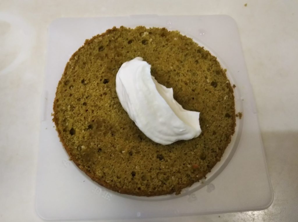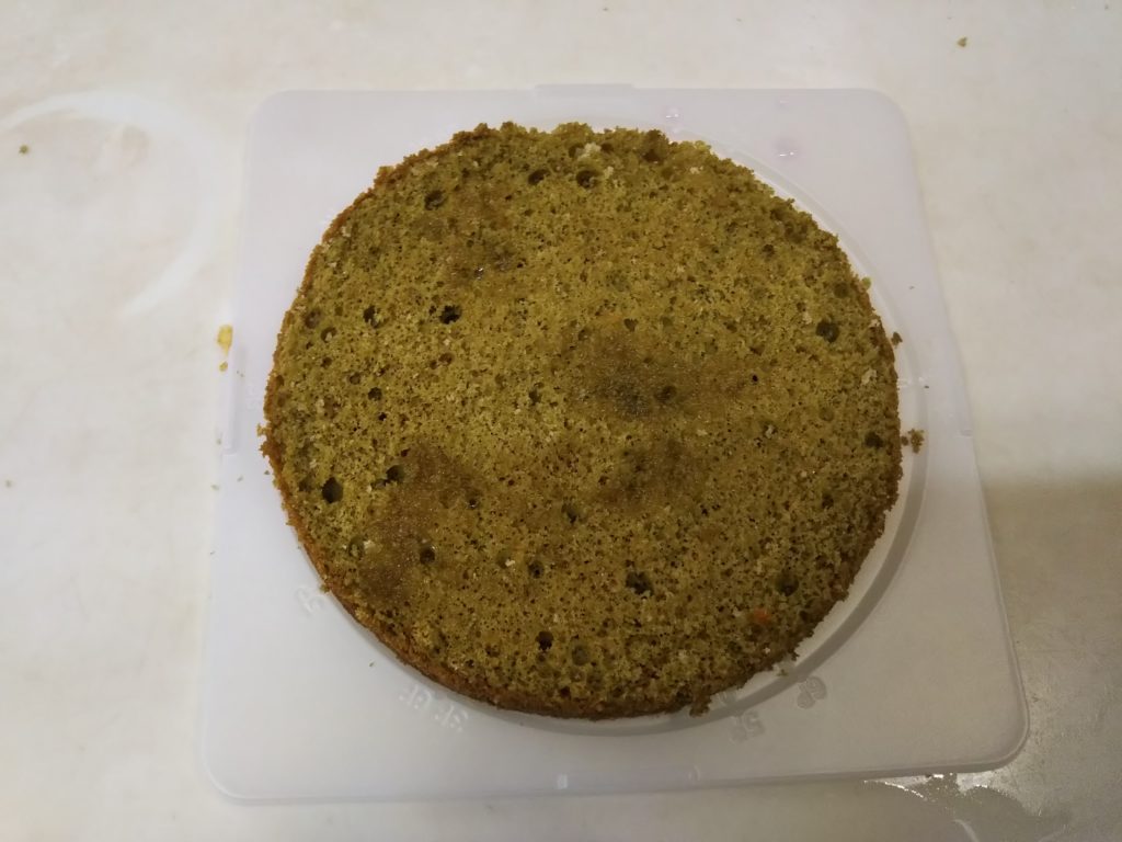 4. 緑のスポンジを皿または回転台にセットする。刷毛でシロップを塗る