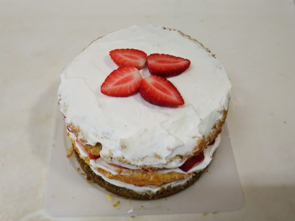 - 1作目は中に挟むイチゴを2つにスライスしたら上に飾るイチゴが足りなくなってしまい、残りの2つでなんとかごまかした。