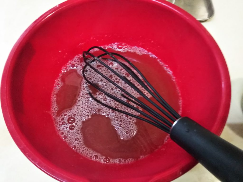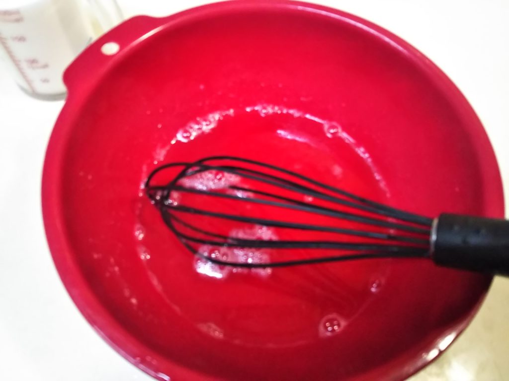 7. パンナコッタが固まったらイチゴゼリーを作る。ボウルにゼリエースと熱湯を入れてよく混ぜる