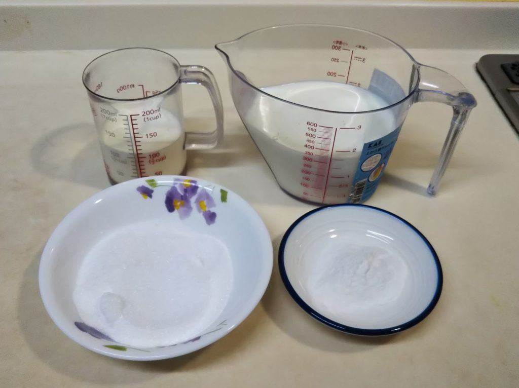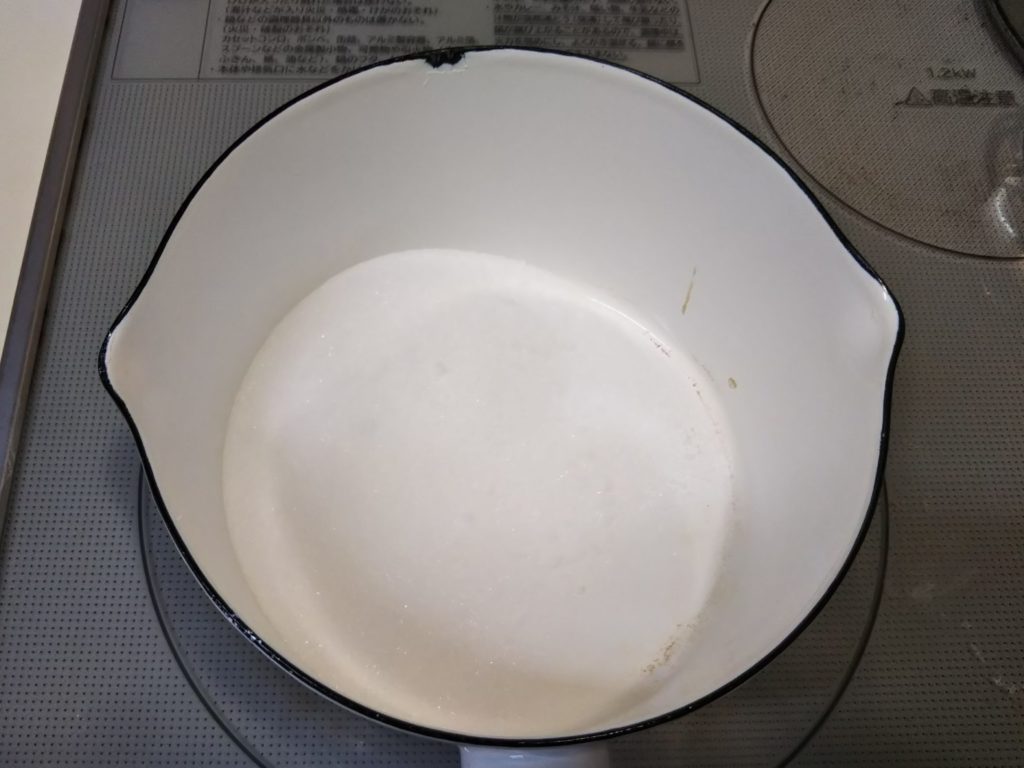 4. メロンゼリーが固まったらパンナコッタを作る。乾いた小鍋に砂糖とアガーを入れてよく混ぜる