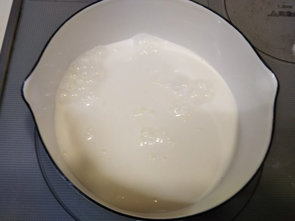 5. 牛乳と生クリームを入れて火にかけ、沸騰する直前で火を止める