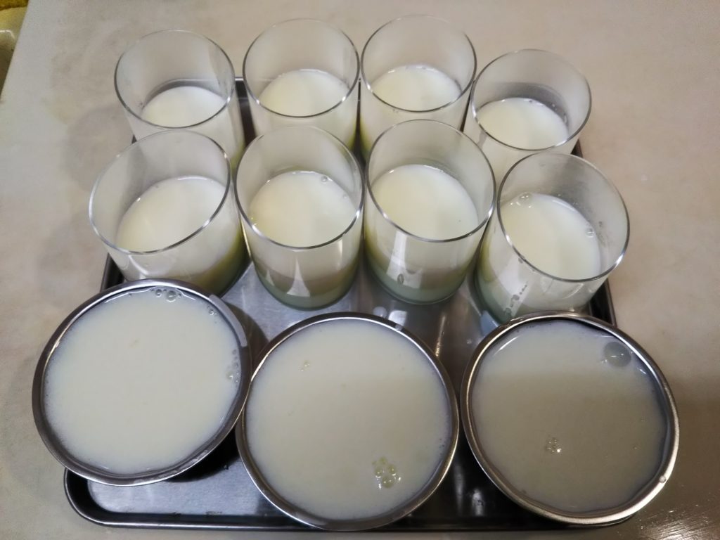 3. デザートカップに大匙2(30㎖)ずつ流し入れる。余った液体はゼリー型に入れる。冷蔵庫で約2時間冷やし固める