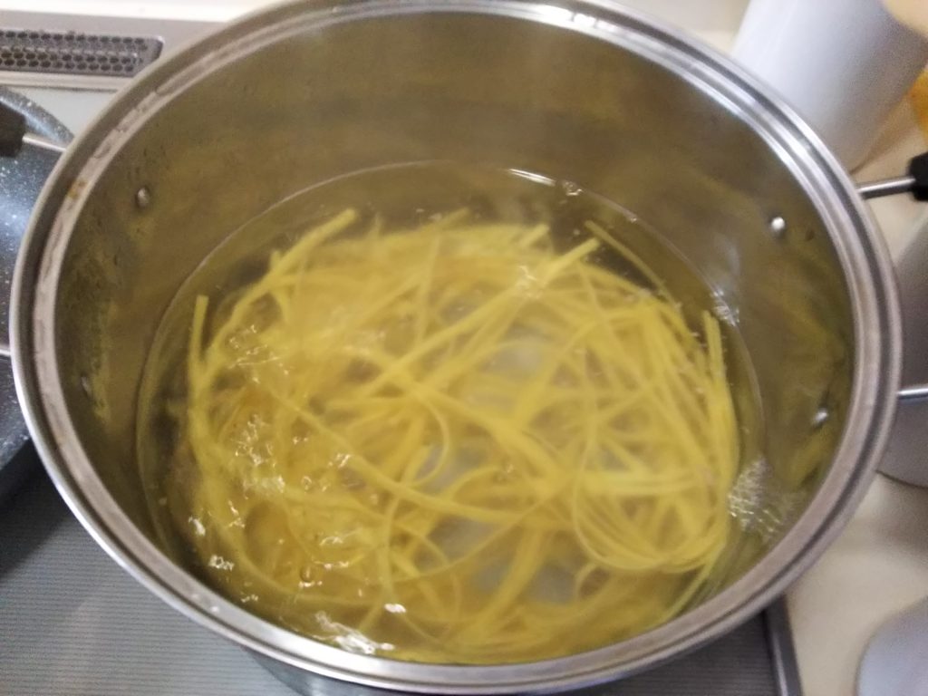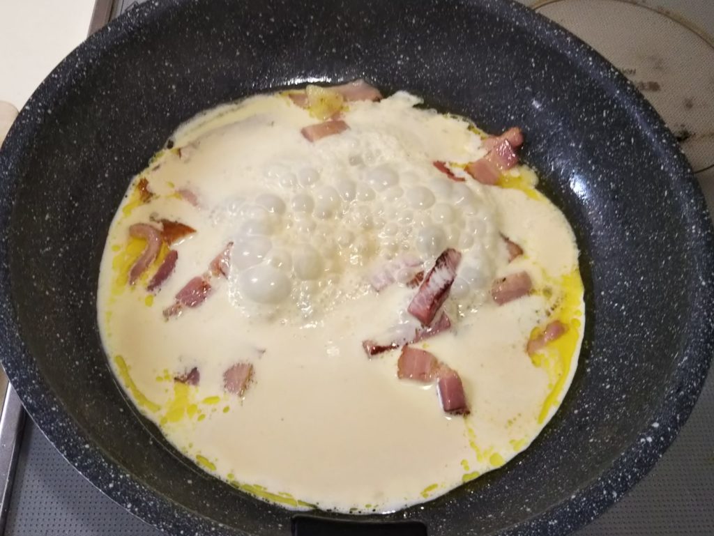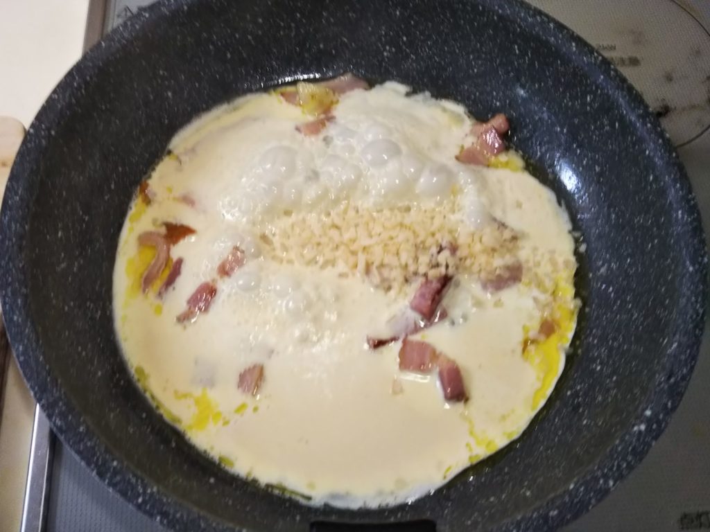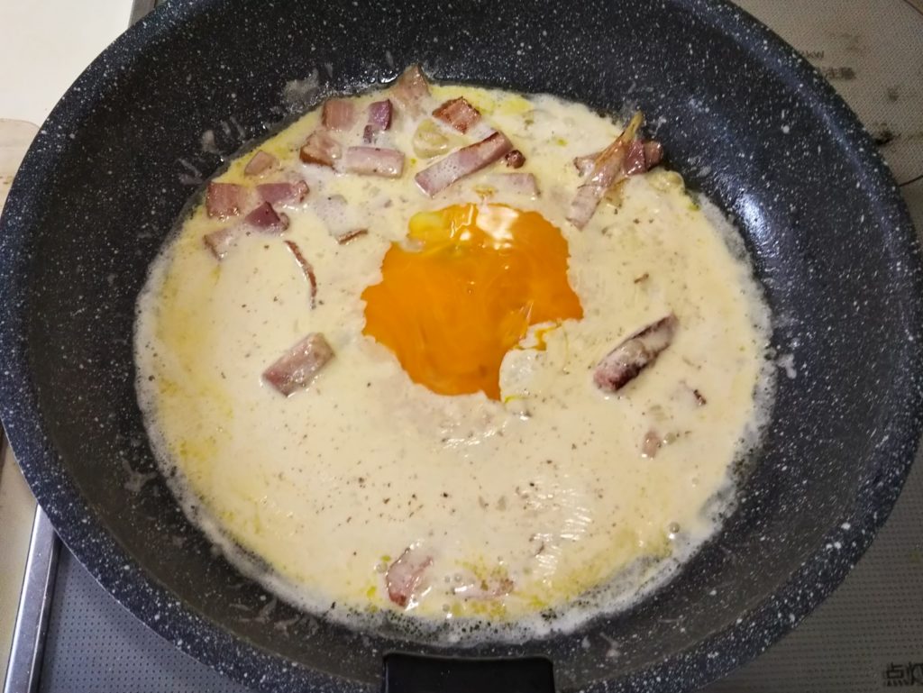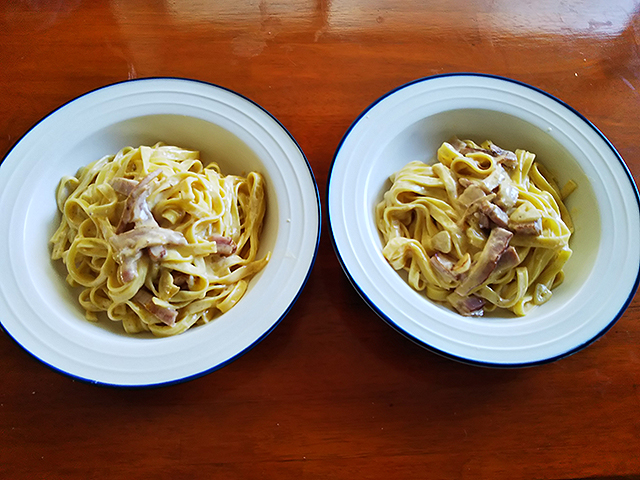 きしめんのような幅広パスタのフェットチーネ、スパゲッティよりももちもちして独特の食感がしますね。これにカルボナーラのこってりしたソースを絡めたら…抜群の相性です。
