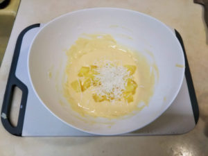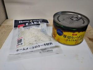 缶詰のパイナップルは一口サイズに切られていましたが、それを更に4つに切って、ココナッツと一緒にホットケーキミックス生地の中に入れて混ぜて、焼きました。