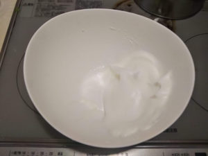 1.卵を卵黄と卵白に分け、卵白には砂糖小匙1を加えて泡立て、メレンゲを作る。
