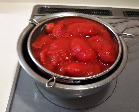 1. トマト缶詰はザルに空けて水分を切っておく