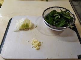 2. 玉葱は薄切り、ニンニクは微塵切り、バジルは茎から葉を離しておく