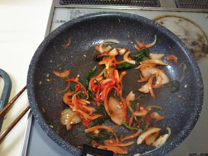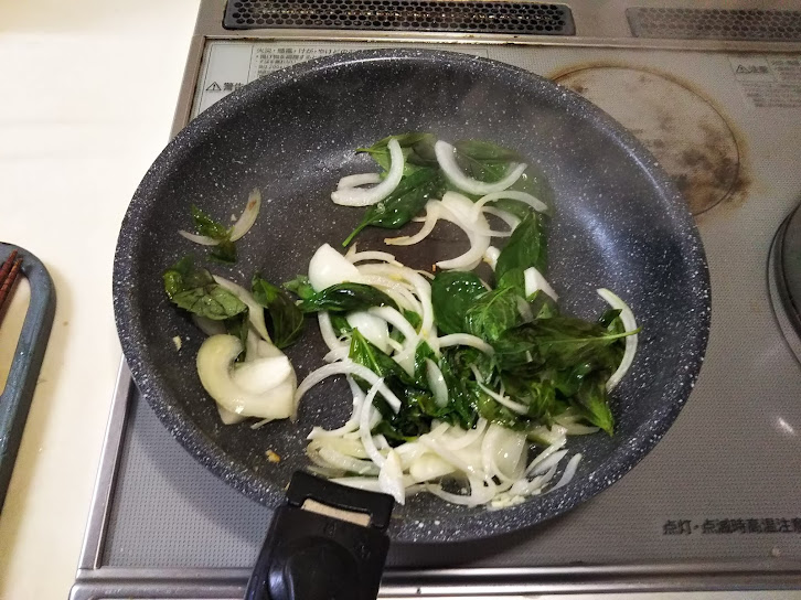 3. フライパンにオリーブオイルを10ml入れて火にかけ、ニンニク、玉葱、バジルを塩を振るかけて炒める